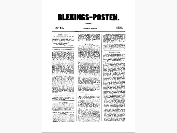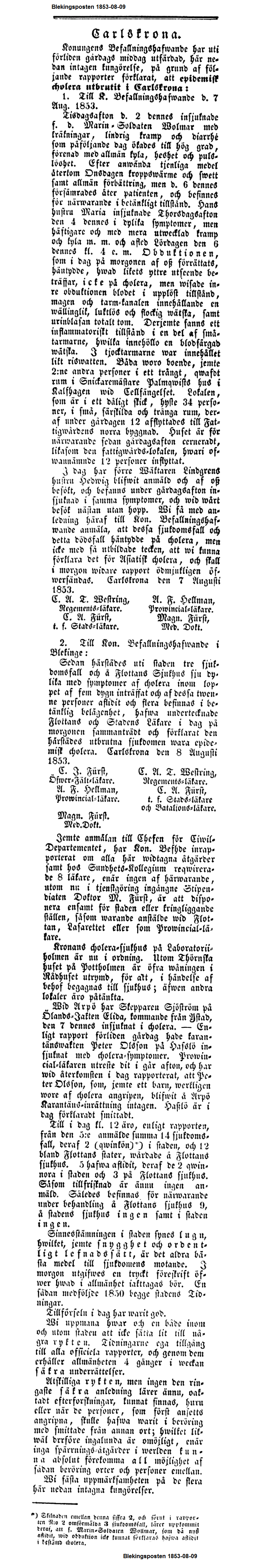 2. Till Kon. Befallningshafwande i Blekinge: Sedan härstädes uti staden tre sjukdomsfall och å Flottans Sjukhus sju dylika mod symptomer af cholera inom loppet af fem dygn inträffat och af dessa twenne personer aflidit och flera befinnas i betänklig belägenhet, hafwa undertecknade Flottans och Stadens Läkare i dag på morgonen sammanträdt och förklarat den härstädes utbrutna sjukdomen wara epidemisk cholera. Carlskrona den 8 Augnsti 1853.