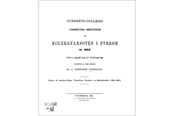 N:r 63. Tisdagen den 9 Augusti. 1853. Carlskrona Konungens Befallningshafwande har uti förliden gårdags middag utfärdad, här nedan intagen kungorelse, på grund af följande rapporter förklarat, att epidemisk cholera utbrutit i Carlskrona: 1. Till K. Befallningshafwandc d. 7 Aug. 1853. Tisdagsafton d. 2 dennes insjuknade f. b. Marin-Soldaten Wolmar mod kräkningar, lindrig kramp och diarrhé som på följande dag ökades till hög grad, förenad med allmän kyla, heshet och pulslöshet. Efter anwända tjenliga medel återkom Onsdagen kroppswärme och swett samt allmän forbättring, men d. 6 dennes försämrades åter patienten, och befinnes for närwarande i betänkligt tillssänd. Hans hustru Maria insjuknade Thorsdagsafton den 4 dennes i dylika symptomer, men häftigare och med mera utwecklad kramp och kyla m. m. och afled Lördagen den 6 dennes kl. 4 e. m. Obduktionen, som i dag på morgonen af oss förrättats, häntydde, hwad likets yttre utseende beträffar, icke på cholera, men wisade inre obduktionen blodet i upplöst tillstånd, magen och tarmkanalen innehållande en wällinglik, luktlös och flockig wätska, samt urinblåsan totalt tom. Derjemte fanns ett inflammatoriskt tillstånd i en del af småtarmarne, hwilka innehöllo en blodfärgad wätska. I tjocktarmarne war innehållet likt riswatten. Båda woro boende, jemte 2:ne andra personer i ett trångt, qwafdt rum i Snickaremästare Palmqwists hus i Kalfhagen wid Cellfängelset. Lokalen, som är i ett dåligt skick, hyste 34 person ner, i sina, särskilda och trånga rum, deraf under gårdagen 12 aflyttades till Fattigwårdens norra byggnad. Huset är för närwarande sedan gårdagsafton cerneradt, likasom den fattigwårds-lokalen, hwari ofwannämnde 12 personer inflyttat. I dag har förre Väktaren Lindgrens hustru Hedwig blifwit anmäld och af oss besökt, och befanns under gårdagsafton insjuknad i samma symptomer, och wid wårt besök nästan utan hopp. Wi få med anledning häraf till Kon. Befallningshafwande anmäla, att dessa sjukdomsfall och detta dödsfall häntydde på cholera, men icke med så utbildade tecken, att wi kunna förklara det för Asiatisk cholera, och skall i morgon widare rapport ödmjukligen öfwersändas. Carlskrona den 7 Augusti 1853.