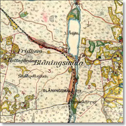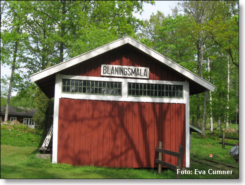 I Blåningsmåla är det bara den raka grusvägen som påminner om att här en gång funnits en järnväg. Både stationshus och godsmagasin är flyttade från platsen. Magasinsbyggnaden finns numera i Rävemåla hembygdspark.